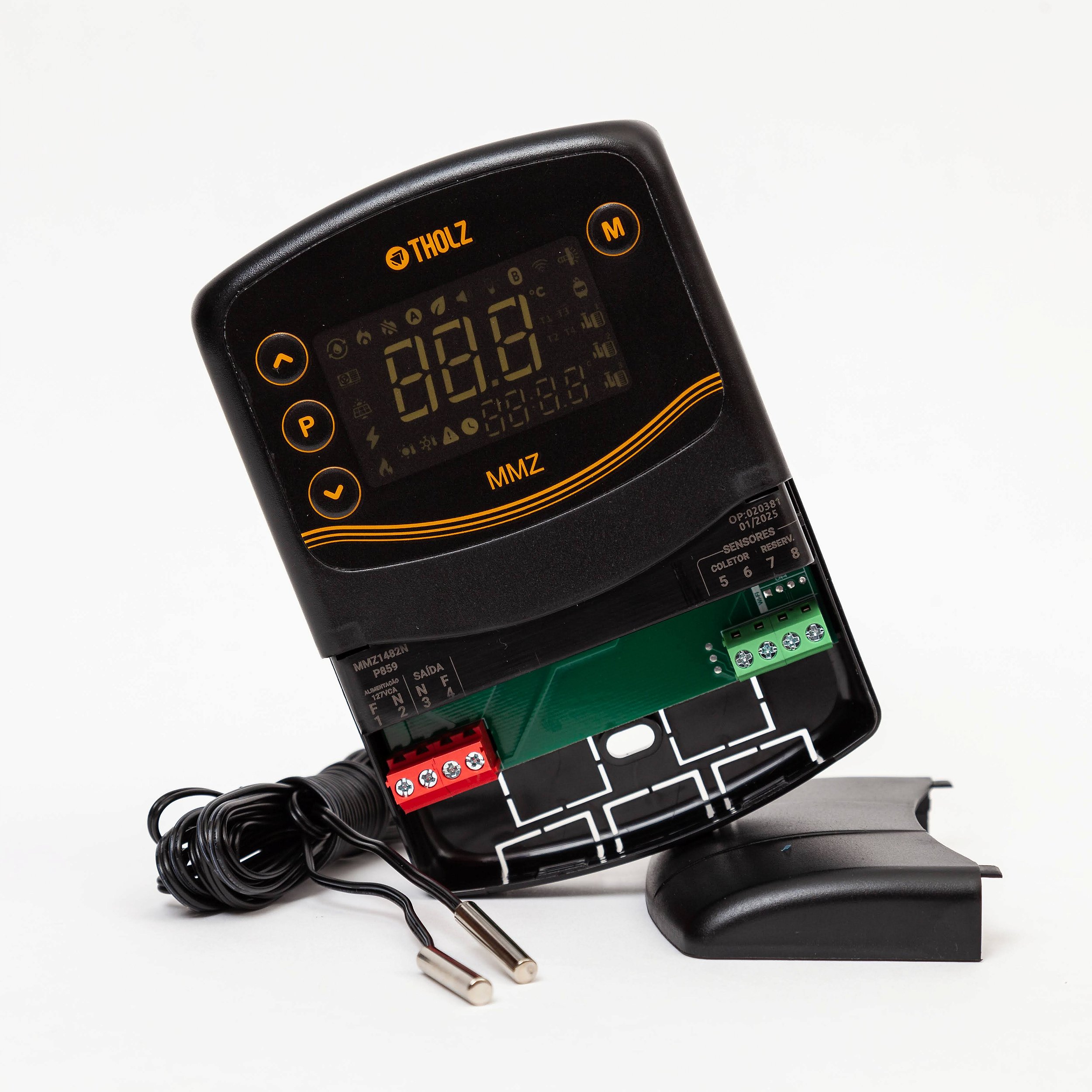 O MMZ da Tholz utiliza um chip (microcontrolador) para gerenciar a circulação da água entre os painéis solares e a piscina, ajustando o fluxo com base na diferença de temperatura entre os dois. Isso automatiza o aquecimento da piscina utilizando o calor do sol.
