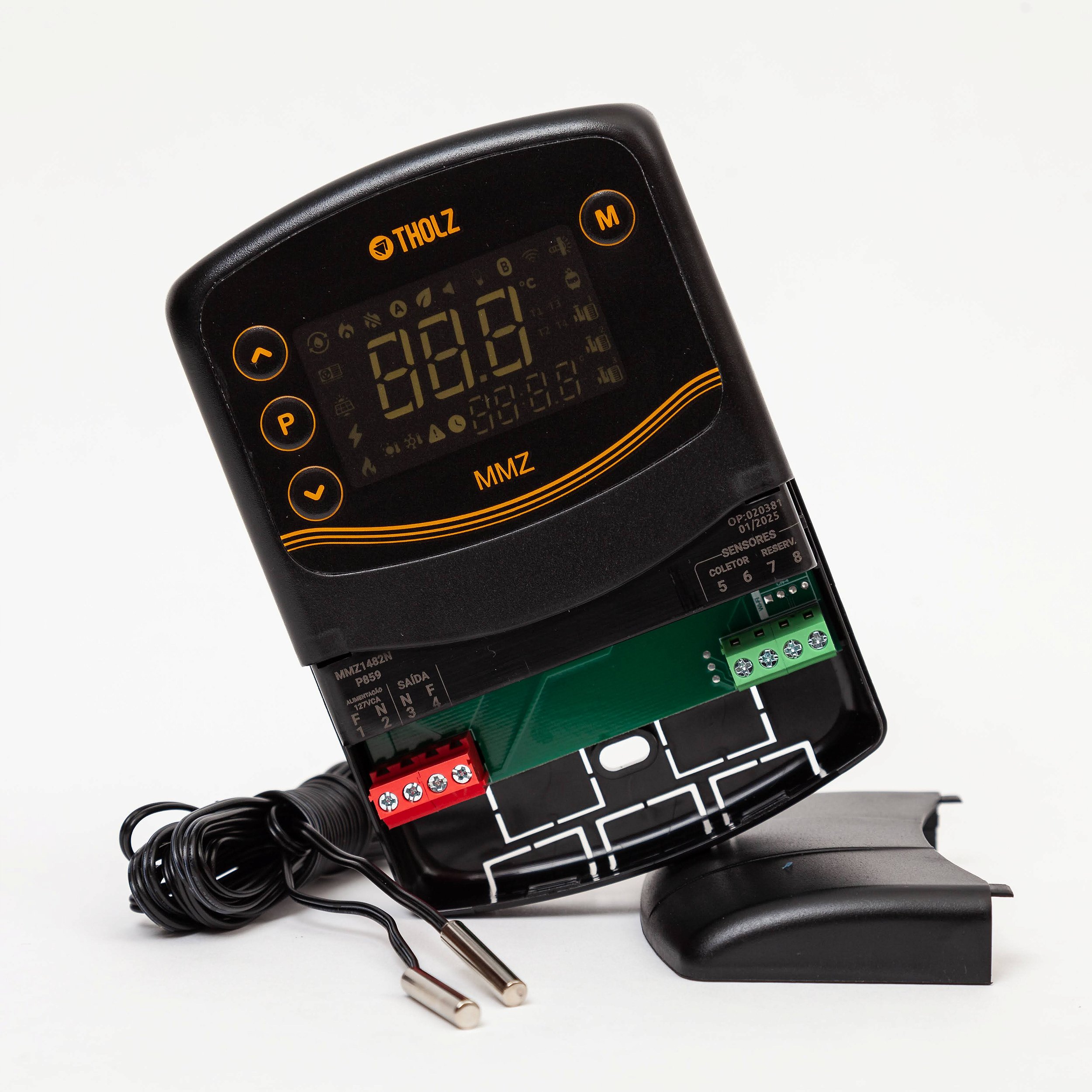 O MMZ da Tholz utiliza um chip (microcontrolador) para gerenciar a circulação da água entre os painéis solares e a piscina, ajustando o fluxo com base na diferença de temperatura entre os dois. Isso automatiza o aquecimento da piscina utilizando o calor do sol.